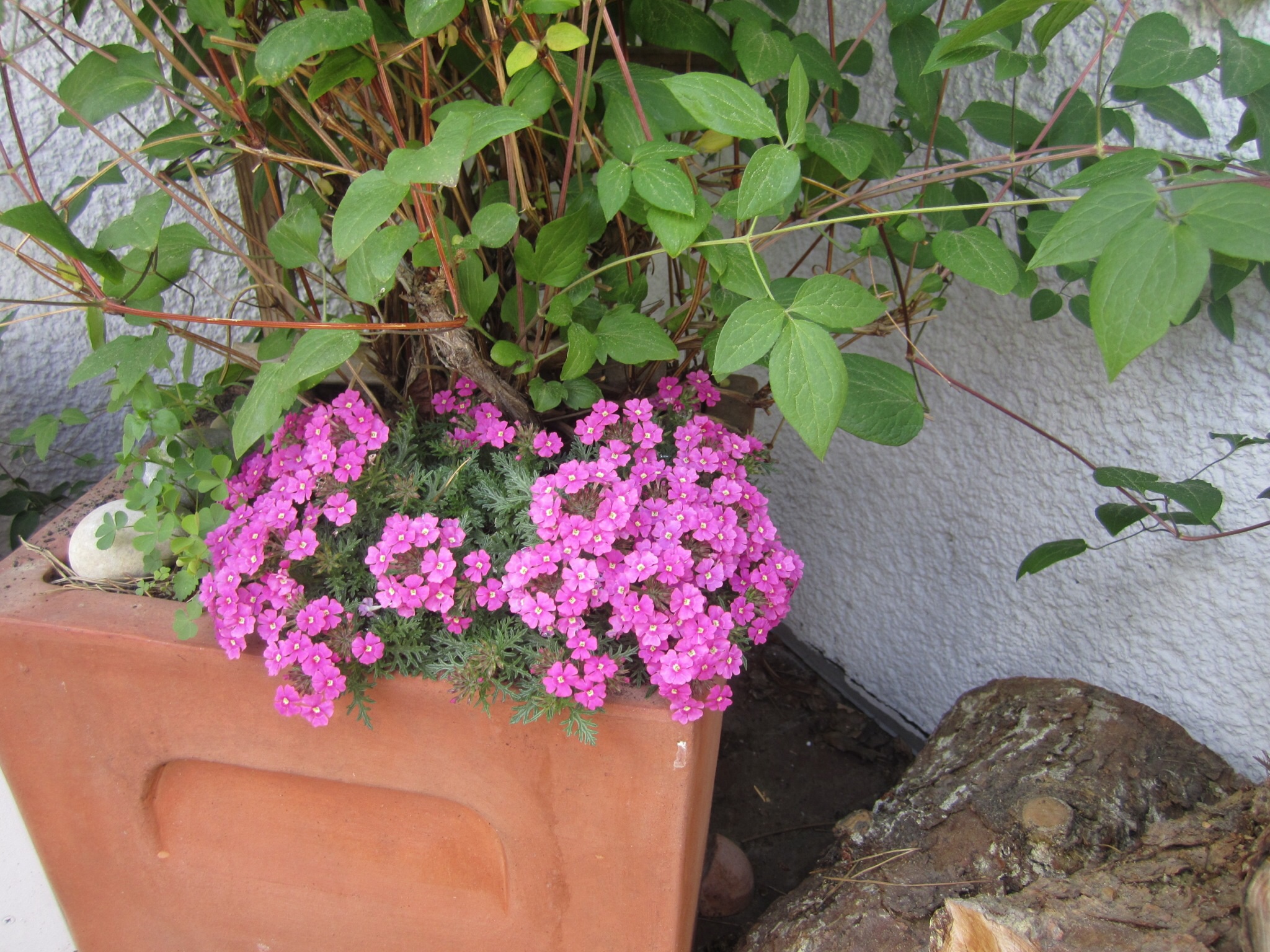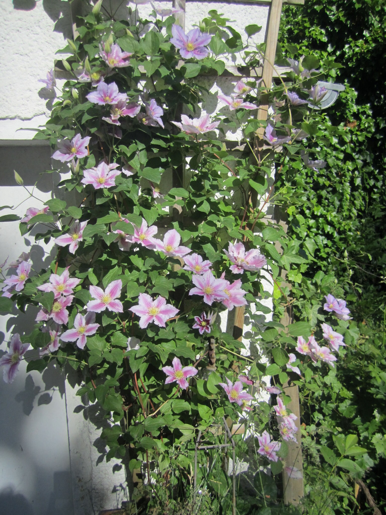 Bald ist es soweit – in wenigen Tagen, vielleicht schon morgen werden die Knospen der großen Clematis in dunkellila aufgehen. Die kleinere mit den hellen mehrfarbigen Blüten blüht bereits und reckt ihre Blüten der Sommersonnen entgegen.